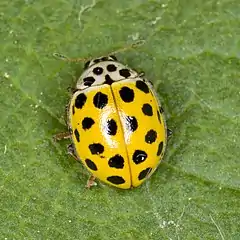 Psyllobora vigintiduopunctata (often abbreviated to Psyllobora 22-punctata), the 22-spot ladybird, (earlier known as Thea vigintiduopunctata) is a common, 3–5 mm long ladybird native to Europe.[2] The elytra are yellow in colour with 22 black spots. The pronotum is yellow or white with 5 black spots.[3] Unlike most other ladybirds which feed on aphids, P. 22-punctata eats mildew — especially from umbellifers and low-growing shrubs .[4] The 22-spot ladybird is best looked for amongst low vegetation.[5]