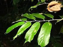Pterospermum grewiifolium trees grow up to 35 m in height: they are relatively common in forested areas of central and southern Viet Nam. The characteristic leaves (illustrated) often have yellow hairs. The winged seeds are approximately 20 mm long and produced from approximately 90 mm pods that are stellate in cross section with 5 segments.[1]