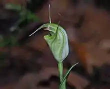 Pterostylis atrans, commonly known as the dark-tip greenhood[2] or blunt-tongue greenhood,[3] is a species of orchid endemic to south-eastern Australia. As with similar greenhoods, plants in flower differ from those that are not flowering. The non-flowering plants have a rosette of leaves flat on the ground, but the plants in flower have a single flower with leaves on the flowering spike. In this species, the flower is green and reddish brown with a protruding sinus and small club-like tips on the ends of the lateral sepals.