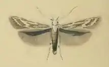The wingspan is 8–9 mm.[2] Adults are on wing from June and July to the beginning of August.[3]