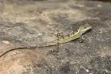 The green fan-throated lizard (Ptyctolaemus gularis) is a species of agamid lizard found in Bangladesh, China (Tibet), India (Northeast- Arunachal Pradesh, Assam, Tripura, Khasi Hills, Mizoram) and Myanmar (Kachin, Chin), and possibly in Bhutan. The type locality, "Calcutta", is in error fide Zhao & Adler 1993;[2] Ananjeva & Stuart (2001) give it as Margherita, in Patkai Mountains, Upper Assam.[3]
