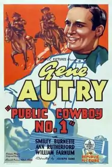 Public Cowboy No. 1 is a 1937 American Western film directed by Joseph Kane and starring Gene Autry, Smiley Burnette, and Ann Rutherford. Based on a story by Bernard McConville, the film is about a singing cowboy who chases down rustlers who are using airplanes, shortwave radios, and refrigerated trucks to steal cattle.[1]