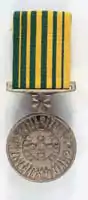 - The reverse displays a wreath of mimosa surrounding the inscription 'For Outstanding Service'.