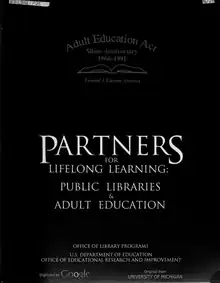 The American Library Association supported the "Adult Services in the Eighties" (ASE) project which replicated an earlier ALA 1952-53 survey, Adult Education Activities in Public Libraries by Helen Lyman Smith.[103] The ASE project was conducted to provide planning for new directions for adult library services.[104] Sources on the scope of adult services include "Where Would We Be without Them? Libraries and Adult Education Activities: 1966–91",[105] "Twenty-First Century Public Library Adult Services",[106]Adult Programs in the Library,[107] and Designing Adult Services Strategies For Better Serving Your Community.[108] A national study of public library service to older adults was conducted in 2015.[109]