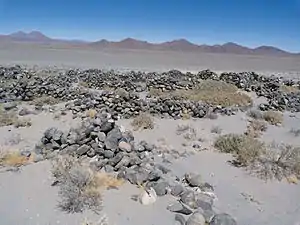 This pukara — Quechuan word meaning fortress or fortified hill—[3] is a Pre-Columbian stone construction located in the area of Turi. The fortified hamlet is located at an elevation of 3,100 m above sea level and occupies a surface area of approximately 4 ha.[2] It is the largest architectural complex built by the Atacama people.[2]