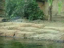 The outdoor enclosure is about 8 by 9 metres (26 by 30 ft), of which 70% is pool area. With a maximum depth of one metre, the pool is landscaped with plants to provide sheltered areas, hiding places and basking areas for the reptile. Outdoor facilities include infra-red heaters, a heat pad and a weighing scale. Water in the pool is continuously circulated through a filtration system.