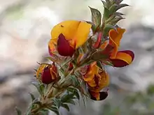 Pultenaea procumbens is a low-lying or spreading shrub that typically grows to a height of less than 1 m (3 ft 3 in) and has hairy young stems. The leaves are arranged alternately, lance-shaped or rhombic, 4–10 mm (0.16–0.39 in) long, 1–4 mm (0.039–0.157 in) wide with tapering, lance-shaped stipules 3–4 mm (0.12–0.16 in) long at the base. The edges of the leaves curve strongly downwards and there is a sharp point on the tip. The flowers are arranged in dense, leafy clusters of more than three on the ends of branches and are 7–9 mm (0.28–0.35 in) long, each flower on a pedicel 1.5–2.0 mm (0.059–0.079 in) long. The sepals are 5–7 mm (0.20–0.28 in) long, joined at the base, and there are lance-shaped bracteoles 4–5 mm (0.16–0.20 in) long attached to the sepal tube. The standard petal is yellow to red and 7–8 mm (0.28–0.31 in) wide, the wings are yellow to orange and the keel is red. Flowering mainly occurs from October to November and the fruit is an egg-shaped pod about 5 mm (0.20 in) long.[2][3][4]