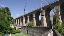 The structure has a length of 242 meters and is up to 37 meters high. It was opened along with the railway track in 1862 and has been electrified since 1988.[2] This structure (as well as the other two viaducts in the city of Luxembourg) are based on plans of Waring Brothers Company.[3]