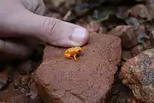 The pumpkin toadlet (Brachycephalus ephippium), or Spix's saddleback toad, is a small and brightly coloured species of frog in the family Brachycephalidae. This diurnal species is endemic to southeastern Brazil where it is found among leaf litter on the floor of Atlantic rainforests at an altitude of 200–1,250 m (660–4,100 ft).[2] It is found in Espírito Santo, Rio de Janeiro, southeastern São Paulo and southeastern Minas Gerais. Although its type specimen supposedly was collected in Bahia about 200 years ago, there are no confirmed localities in this state and recent reviews consider it more likely that it was from Rio de Janeiro.[2][3] B. ephippium is locally common,[3] quite widespread compared to most other species of Brachycephalus and it is not considered threatened.[1][2]