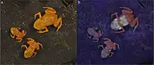 In 2019, scientists discovered that the head and back of this toadlet and the closely related red pumpkin toadlet (B. pitanga) glowed under ultraviolet light, due to their fluorescent skeletons.[11][12] Young that have gained the bright yellow-orange adult colours still lack their fluorescence. It was initially speculated that the fluorescent colour also is aposematic or that it is related to mate choice (species recognition or determining fitness of a potential partner),[12] but later studies indicate that the former explanation is unlikely, as predation attempts on the toadlets appear to be unaffected by the presence/absence of fluorescence.[13]