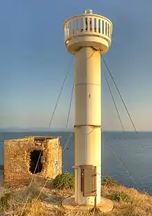 The first lighthouse was built in 1905 and consists of a white octagonal prism stone tower, 9 feet (2.7 m) high, with balcony and lantern, rising from a 2-storey white keeper's house. On November 8, 1987, a mysterious explosion damaged the lighthouse, but the keeper, Domenico Calabrese, was off duty and survived. The lighthouse remained inactive until the 1990s. when a new white cylindrical fibreglass tower, 4 metres (13 ft) high, with light and gallery was established. The lantern, positioned at 48 metres (157 ft) above sea level, emits three white flashes in a 10 seconds period, visible up to a distance of 11 nautical miles (20 km; 13 mi). The lighthouse is completely automated, powered by a solar unit and is managed by the Marina Militare with the identification code number 3844 E.F.[2][3][4]