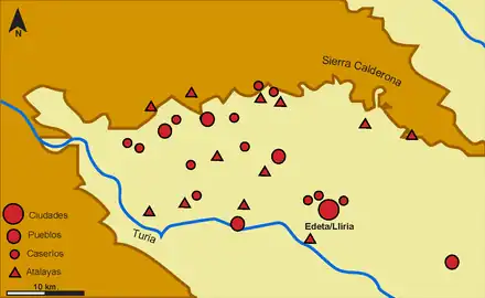 Puntal dels Llops is a small Iberian hilltop fort, located near the modern town of Olocau, in Valencia province. It overlies an earlier Bronze Age site.[1] Its original name in Iberian is unknown. It was built in the late fifth or early fourth century BC and destroyed violently around the end of the Second Punic War or in the early second century BC. The site is part of a network of fortified sites that surround the large Iberian town of Edeta (Tossal de Sant Miguel, Llíria) and so is important to understanding the formation and organisation of Iberian polities.[2] The archaeological site may currently be visited.
