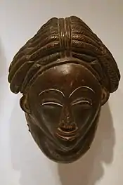 Male dancers are known to wear the Okuyi while dancing.[12] The white-faced masks are also used by other Gabon and Zaire rainforest people, such as the Kotas and Mpongwe,[13] The Ashira also share in the white-faced mask tradition, which includes soft facial characteristics.[14] The masks have been linked to the Mukui society and to female ancestor celebration dances,[7] a funerary spirit association.[15] A variation of the Punu-Lumbo mask is produced by the Tsangui in the northern Democratic Republic of the Congo.[16]