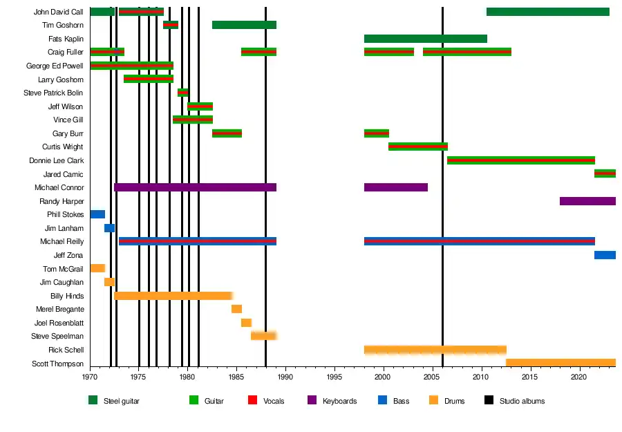 - John David Call — pedal steel guitar, banjo, dobro (1970–1972, 1973–1977, 2010–present; guest 2006–2007)