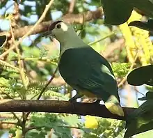 The purple-capped fruit dove or Pohnpei fruit dove (Ptilinopus ponapensis), is a species of bird in the family Columbidae found on Chuuk and Pohnpei in the Caroline Islands. It was formerly considered as a subspecies of the crimson-crowned fruit dove.[2] Its natural habitats are subtropical or tropical moist lowland forests and subtropical or tropical mangrove forests.