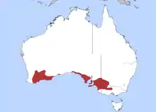 They occur in disjunct populations across southern Australia, east from southern Western Australia, with the eastern population largely occurring south of the Murray River, and NSW forming the extreme north-east of its range.[3] Despite its naturally disjunct populations, the purple-gaped honeyeater has very low genetic diversity across its range.[5]
