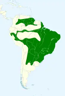 It is found in Argentina, Bolivia, Brazil, Colombia, Ecuador, French Guiana, Guyana, Paraguay, Peru, Suriname, Uruguay, and Venezuela.