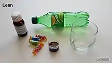 The term lean refers to the fact that users may have difficulty standing up straight while under the influence of the drug.[2] "Purple drank" references its typically purple hue, as the cough syrups employed are often purple in color, and an African-American Vernacular English term for an alcoholic beverage or intoxicating drink. Other names include "sizzurp", "syrup", "drank", "barre", "purple jelly", "wok", "wock", "Texas tea", "Memphis mud" and "dirty Sprite".[3][4][5][6][7][8]