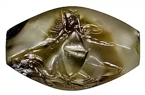 The Pylos Combat Agate is a Minoan sealstone of the Mycenaean era, likely manufactured in Late Minoan Crete. It depicts two warriors engaged in hand-to-hand combat, with a third warrior lying on the ground.[1][2] It was discovered in the Griffin Warrior Tomb near the Palace of Nestor in Pylos and is dated to about 1450 BCE.[3] The seal has come to be known as Pylos Combat Agate.[2]