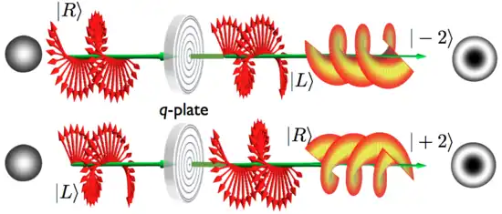 A q-plate is an optical device that can form a light beam with orbital angular momentum (OAM) from a beam with well-defined spin angular momentum (SAM). Q-plates are based on the SAM-OAM coupling that may occur in media that are both anisotropic and inhomogeneous, such as an inhomogeneous anisotropic birefringent waveplate. Q-plates are also currently realized using total internal reflection devices, liquid crystals, metasurfaces based on polymers, and sub-wavelength gratings.[1]