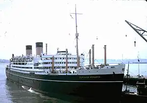 From June to November 1962 Mitsui leased Dominion Monarch as a floating hotel and entertainment centre for Seattle's Century 21 Exposition, along with the Mexican-owned Acapulco and Canadian-owned Catala.[48] She arrived at Seattle on 29 May 1962.[49] The onboard hotel was managed by Western Hotels.[50] Accommodation demand was less than predicted, Dominion Monarch's US charterer lost $200,000 and her charter was reduced by several weeks. The exhibition closed on 21 October and the ship arrived in Osaka, Japan on 25 November to be scrapped.[5]