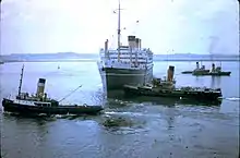 Dominion Monarch spent the next 18 months operating a transatlantic service between either Liverpool or the Clyde and New York, starting with Convoy UC 45B which left the Mersey on 18 November 1944[37] and continuing until Convoy UC 68A which reached New York on 28 May 1945.[38] In that time she made six round trips between Britain and New York. Her schedule was interrupted once, in 1944, when the Captain-class frigates HMS Burges and Inman escorted her on a mission from the Clyde to Iceland and back. The three ships left the Clyde on 20 August and returned just four days later.[39][40]