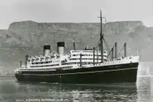 Holland America Line's flagship Nieuw Amsterdam in peacetime colours. As a troop ship Nieuw Amsterdam sailed with Dominion Monarch in Convoy WS 12 in 1941 and Convoy US 19 in 1943