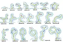Shapes of the 20 natural amino acids as they appear in an experimental electron density map at 1.5 angstrom resolution.