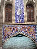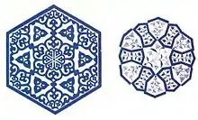 Qashani or Kashani is a Persian decorative arts which had been popular in Iran in the 16th to 18th century, and then moved to Turkey in the time of the Ottomans with the transfer of many Persians artists to Turkey, becoming the basis for decorating the walls of mosques, palaces, shrines and tombs. It is a square-shaped ceramic tile which uses Persian-like floral-depicting 4- or 6-sided glazed tiles, decorated with blue, cyan, green and sometimes red colors. The decoration is surrounded by fine black lines that make it stand out on its white floor. The tile work had often been decorated by the inscription, floral and geometrical patterns. The inscription often provides Qur'anic verses or sentences related to historical events written in Persian script. The plant often consists of natural flowers such as lily, cloves, roses and cypress trees. Geometrical patterns consists of different geometrical shapes and polygons. In Morocco, similar artistic technique is known as zillij. Its use has been widespread in the decoration of the walls of the buildings in the Ottoman era, and this mosaical feature can also be seen in the Dome of the Rock in Jerusalem. Kashi, the abbreviated form of Qashani, was also introduced to Sindh, Kutch, and Multan where numerous examples of shrines and mosques embellished with blue, white and green tile work exist.[1]