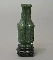 Handicrafts in the Qing era are marked by their ornamentation, use of colors, and innovative production technologies. These aspects not only enhanced the quality of objects produced, but added to their value as luxury products as it was easier for artisans to incorporate more complex techniques in their work. The advancement of handicraft technology and the contact between specialized artisans at imperial workshops resulted in the possibility of combining multiple raw materials in a singular object, such as the hardwood being inlaid with enamelled porcelain.[1] With the increase of trade networks and the tributary system, the centers of certain handicraft traditions shifted as raw materials such as hardwoods and ivory from Southeast Asia, marble from Yunnan, and jade from Burma[4] were able to be imported from different locations. For example, Suzhou became the center of the production of carved lacquer, jade carving, metalwork, silks, and furniture by the 18th century, replacing than the various center located in the towns of western Zhejiang.[5] Taste for handicrafts also differed between the court and the literati. For example, the imperial household preferred blue-and-white porcelain in the 18th century while the literati preferred archaistic bronzes or ceramic imitations of bronzes.[6] Handicrafts from the imperial manufactory set the standard, but the commercial market had a larger output in comparison.[7]