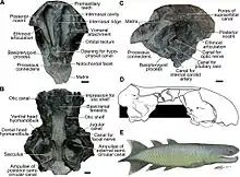 (A) Anterior cranial portion (IVPP V16003.5) in ventral view. (B) Posterior cranial portion (IVPP V16003.6) in ventral view. (C) Anterior cranial portion (IVPP V16003.5) in right lateral view. (D) Tentative restoration of the natural shape of the neurocranium in right lateral view. (E) Life restoration by Brian Choo. This figure appeared in Lu et al. (2016) Science Advances, vol. 2, no. 6, e1600154.