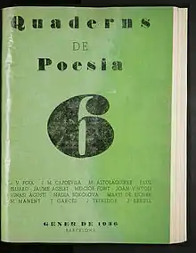 Quaderns de poesia (in English Poetry Notebooks) is a poetry Catalan magazine. Its publication started in June 1935 and continued until 1936 when it had to be interrupted due to the Spanish Civil War. In total 8 volumes were published monthly. It was directed by a staff including Josep Vicenç Foix, Tomàs Garcés, Marià Manent, Carles Riba and Joan Teixidor.[1] It was a high quality magazine regarding its presentation and its content. The magazine had 32 pages with 2 columns each and the dimensions were 240x185mm. The impression was done in Castells Bonet, S.A. and the editing office was in the Street Carrer de les Corts Catalanes 660 in Barcelona. The price was one and a half peseta.