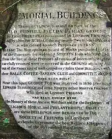 In 1661 the London Quakers purchased a plot of land here of 30 square yards for £270 for use as a burial ground: it constituted the first freehold property owned by Quakers in London.[2] This was four years earlier than the opening of the nearby "Dissenters'" burial ground, on the other side of Bunhill Row, which is still known as Bunhill Fields. As well as burials arising from routine deaths, the bodies of 1,177 Quakers who died in the Great Plague of 1665–66 were buried here.[2] The ground was soon full, but additional plots of land were purchased to extend it, until by c. 1845 about £3,600 had been invested in the site.[2] The ground was closed for burials in 1855, by which date around 12,000 burials had taken place.[2][3]