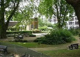![]() View of Quaker Gardens. The brick building in the background is the former caretaker's house of the Bunhill Memorial Buildings (1881), now a Quaker meeting house. | |