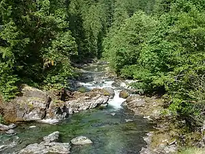Quartzville Creek is a 28-mile (45 km) tributary of the Middle Santiam River in Linn County in the U.S. state of Oregon.[4] It is paralleled by the Quartzville Back Country Byway and used for recreation, including camping, fishing, hunting, kayaking, and gold panning.[6] The lower 12 miles (19 km) of the creek, from the Willamette National Forest boundary to Green Peter Reservoir, was designated Wild and Scenic in 1988.[7]