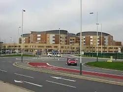The hospital comprises four, circular, five-storey buildings, connected and surrounded by a wider two-storey building. The ground and first floor levels generally consist of diagnostic treatment, whilst the upper levels consist of inpatient services and wards. Facilities include an accident and emergency (A&E) department, hyper-acute stroke unit (HASU), birthing centre, renal dialysis unit, specialist neuroscience centre, 16 operating theatres and a helipad.[4][5]