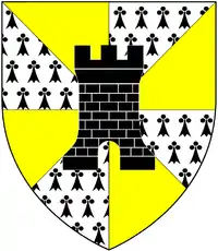 | Hooper: Gyronny of eight or and ermine, a tower triple towered sable. For Sir Nicholas I Hooper (1654-1731) of Fulbrooke, Braunton, Serjeant-at-Law,[50] MP for Barnstaple 1695-1715,[51] who purchased nearby Raleigh House, Pilton (now the site of the Barnstaple Hospital), from his fellow MP Arthur Champneys in 1703.[52] Richard Hooper was Mayor of Barnstaple in 1660 and 1674.[53] He was buried at Barnstaple, with "his magnificent funeral attracting some caustic comment".[54] The son of Sir Nicholas I Hooper was Nicholas II Hooper who rebuilt Raleigh House on an adjacent site slightly higher up the hill, which building survives today. Nicholas II Hooper's heir was his sister Elizabeth Hooper (d.1726), who in 1713 married John Bassett (1683-1721),[50] of Heanton Punchardon, MP for Barnstaple 1718-1721. She survived her husband and remarried to Rev. Thomas Morrison, and was buried at Bath Abbey. Her descendant Rev. Hooper Morrison in 1769 purchased Yeo Vale, Alwington and married Charlotte Orchard (d.1791), whose monument survives in the Yeo Vale Aisle of Alwington Church, sister and in her issue heiress of Paul II Orchard (1739-1812) of Hartland Abbey. Rev. Thomas Hooper Morrison (1767-1824) was the owner of Yeo Vale, Alwington in 1810 and of Hartland Abbey.[55] These arms are shown in enamel with tinctures on the staircase of Barnstaple Guildhall, with the name "Hooper" inscribed on the frame. These gyronny arms, with variant tinctures, were also borne by Howper of Musbury, Devon;[56] by George Hooper (1640-1727), of Grimley, Worcestershire, Bishop of Bath and Wells; by Hooper of Hendford, Yeovil, Somerset; by Hopper of Shincliffe, Durham; by Hopper of Witton Castle, County Durham. | ||||