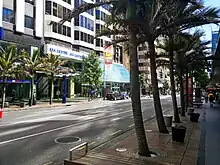 This involved the widening and relaying of footpaths with basalt kerbstones and paving. Granite insets, designed in consultation with the local Māori (Ngati Whatua iwi), as well as recycled redchip pavers from the existing footpath, were used to denote special areas – such as those related to the existence of the old Waihorotiu Stream. New street furniture (such as multi-purpose poles for lighting, signage and pennants) and new trees and other landscaping were added to create a 'boulevard effect'.[16] The liquidambars and Nīkau Palms chosen for the new design touched off heated public discussion in 2006 as their inclusion came at the destruction of previous, established trees (which were not native flora of New Zealand, and thus not retained in the new landscaping plan).[17]