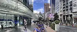 The changes included further improvements to pedestrian facilities, with the total footpath area increasing by 20% to almost 14,000 m2,[22] and longer traffic signal phases for pedestrians, while three new signalised pedestrian crossings were introduced mid-block, at accident 'black spots'. Also undertaken was a reduction of on-street parking spaces from 81 to 51, part of the prioritisation for pedestrians. The remaining spaces became dedicated short-term parking (i.e. drop-offs, loading). Not included in the design were dedicated bus bays, noted as a serious oversight by some critics, causing potential delays on the proposed bus lanes.[16][21][23]