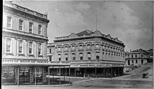 Named after Queen Victoria, Queen Street was an early development of the new town of Auckland (founded in 1840), although initially the main street was intended to be Shortland Street, running parallel to the shore of Commercial Bay.[1] The early route of Queen Street led up the middle of a gully following the bank of the Waihorotiu Stream (later bounded in as the 'Ligar Canal'). This canal was culverted beneath the street from the 1870s onward, allowing for further development of the street to be undertaken. The course of the stream is still reflected today in the slight bend of lower Queen Street. From north of Shortland Street, Queen Street is built on land reclaimed from the sea in the late 19th century (see Auckland waterfront article).