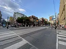 From Woodbine to Coxwell, Queen Street is in parts of two neighbourhoods, Upper Beaches and The Beaches.[9][10] From Woodbine to Kingston Road, there's a mix of newer commercial/residential buildings. The northern half is covered with various modern looking stores, with the southern half covered by a retail development by The Behar Group, consisting of 5 residential condos, with ground floor retail spaces.[11] The section of Kingston to Coxwell is similar in design, but without the retail development on the southern side, including the Alliance Cinemas The Beach location. A little to east of the Queen/Eastern/Kingston intersection there is the northern border of Woodbine Park, used for outdoor events.
