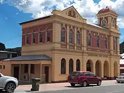 The current Queenstown Post Office (originally a Post, Telegraph and Money Order Office) was constructed in 1902, replacing the earlier building. Charles W. Leeming was the first postmaster, and the building was designed by the Tasmanian Government Public Works Office, prior to the Commonwealth taking over this responsibility. The substantial two-storey stucco building was erected at the tailend of the town's boom period, but reflected the growth and optimism of the preceding years. It underwent alterations and additions in 1907. The clock and chimes were not installed until 1909.[1]