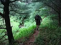The Quehanna Trail is a 73.2-mile (117.8 km) hiking trail in north-central Pennsylvania, forming a loop through Moshannon State Forest and Elk State Forest.[1] For about 34 miles, the trail traverses Quehanna Wild Area,[2] and its main trailhead is at Parker Dam State Park.[3] It also passes through two State Game Lands.[4] There are also three cross-connector trails allowing shorter loop hikes of various lengths.[5] A spur trail leads to the village of Wyside where the hiker can, via some relatively brief road walking, reach the Donut Hole Trail and Bucktail Path.[6] The Quehanna Trail is known for visiting numerous vistas and a wide variety of landscapes, including open meadows that are relatively rare for this region of Pennsylvania, plus steep stream hollows, high plateau-tops, and several different forest ecosystems.[7]