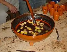 Queimada has origins in the celtic pagan festivals of Galicia.[1] Probably is an inheritance of the ancient celtic druids that has been transmitted along generations. It is a punch made from Galician aguardente (Orujo Gallego) - a spirit distilled from wine and flavoured with special herbs or coffee, plus sugar, lemon peel, coffee beans and cinnamon.
