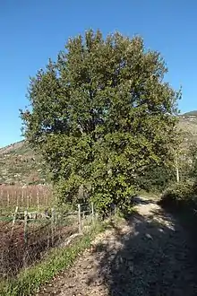 Hybridisation occurs naturally in southwestern Europe where both parent species occur.[5] The Lucombe oak cultivar (Q. × crenata 'Lucombeana') is frequently found in British collections. To be a true Lucombe oak, cultivars must be clones of the original hybrid arising in William Lucombe's Exeter nursery.[6] "Lucombeana' has received the Royal Horticultural Society's Award of Garden Merit.[7]