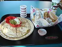 A quesadilla (/ˌksəˈdjə/; Spanish: [kesaˈðiʝa] ; Mexican diminutive of quesada[1][2]) is a Mexican dish consisting of a tortilla that is filled primarily with cheese, and sometimes meats, spices, and other fillings, and then cooked on a griddle or stove.[3] Traditionally, a corn tortilla is used, but it can also be made with a flour tortilla.