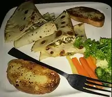 Quesadillas have been adapted to many different styles. In the United States, many restaurants serve them as appetizers, after adding their own twist.[16] Some variations use goat cheese, black beans, spinach, zucchini, or tofu.[17] A variation that combines the ingredients and cooking technique of a quesadilla with pizza toppings has been described as a "pizzadilla".[18][19]