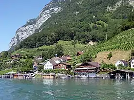 Agriculture, dominated by vineyards, is still an important factor in Quinten's economy. The locally grown wines, predominantly Pinot Noir which accounts for about 75% of the total harvest, enjoy a very good reputation among connoisseurs. Other varieties grown in Quinten include: Pinot Blanc, Baco Noir, Chardonnay, Chasselas, Merlot, Seyval Blanc and Syrah. In 2008 vineyards covered more than 76000 square meters, and more than 47 tonnes of grapes were harvested.[5] Other forms of farming are on the retreat though, as the very steep terrain makes agricultural work very hard. Thanks to the mild climate, exotic fruit, like figs and kiwifruit, thrive in Quinten in a way that is unique north of the alps. These crops, however, are of little economic value and are mainly grown for the use of the locals.