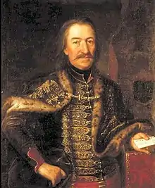 Maté's son, Péter, went onto lead a Šajkaši army and was eventually captured by the Ottomans.[8] Another member of the family, Simon Ráday was elevated to the position of canon of Szepes in the 1500s.[8] The steady rise of the family continued over the coming century, as András Ráday, grandson of István I, was asked to represent Nógrád at the Royal Diet of 1649 in Pozsony.[8] His son, Gáspár II Ráday (1682–1711), assumed the same position in Pest at the subsequent diets, solidifying the political emergence of the family.[8]