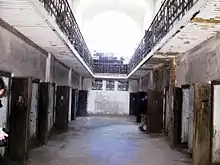 Political prisoners were held at the prison from 1947 to 1963, in the individual cells, while common criminals inhabited the large rooms.[4] The two groups were kept completely separate and forbidden from communicating. From 1947 to 1952, the number of prisoners varied between 80 and 200, with common criminals forming the majority. The first political prisoners, who arrived in the second half of 1947, were “saboteurs”: peasants who were unable to hand over quotas of livestock and grain, as well as members of non-communist parties from Râmnicu Sărat County. Starting in 1949, opponents of collectivization and of the nascent communist regime joined the ranks.[5] In 1948-1949, an effort at “re-education” involved lecturing prisoners about the achievements of the Petru Groza government and the benefits of “people’s democracy”, reading progressive brochures together and leaving Marxist books in their cells.[6] Until 1952, it was a transit prison, holding detainees for several months until they were moved to other prisons or to the Danube–Black Sea Canal. After the end of the experiment in “re-education” at Pitești Prison, part of the torturers were brought to Râmnicu Sărat for interrogation. Until 1955, most of the political prisoners there were Iron Guard members, among them Nicolae Petrașcu. That year, the surviving defendants tried alongside Iuliu Maniu arrived: National Peasants' Party (PNȚ) affiliates Ion Mihalache, Ilie Lazăr, and Victor Rădulescu-Pogoneanu. In 1957, in the aftermath of a hunger strike at Aiud Prison, the strike leaders, among them Ion Diaconescu, were sent to Râmnicu Sărat, followed by more political prisoners: Corneliu Coposu, Alexandru Alexandrini, Alexandru Constant, Constantin Pantazi, Ion Petrovici, Petre Tomescu, and Gheorghe Jienescu.[5]